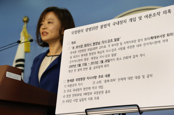 민주사회를 위한 변호사모임의 박주민 변호사는 “법적으로 국정원은 국내 정치에 개입할 수 없게 돼 있다. 하지만 국정원은 광범위한 국내 정치 개입을 통해 자신의 영향력을 넓히려는 권력기관의 속성을 끊임없이 보여왔다. 이번 기회에 국정원 내에서 국내 부문을 담당하고 있는 부서를 아예 없애야 한다”고 밝혔다. 표창원 전 경찰대 교수는 “정치 개입의 정점에 있는 원 원장을 당장 출국금지하고 철저하게 수사해야 한다. 국회에서 국정조사를 통해국정원 대선 개입 의혹의 실체를 낱낱이 밝혀야 한다”고 말했다. 정환봉 기자bonge@hani.co.kr