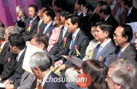 “불심 잡자” 한데 모인 여야… 21일 서울 종로구 견지동 조계사에서 열린 불기 2554년 부처님 오신 날 봉축 법요식에 한나라당 정몽준, 민주당 정세균, 자유선진당 이회창, 민주노동당 강기갑, 창조한국당 공성경 대표와 서울시장 선거에 출마한 한나라당 오세훈, 민주당 한명숙, 자유선진당 지상욱, 진보신당 노회찬 후보(왼쪽부터) 등 여야 정치인들이 대거 참석해 불심 잡기에 힘쓰고 있다. /이태경 기자 ecaro@chosun.com