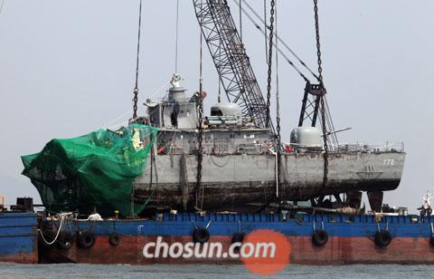 이날 드러난 천안함 함미는 좌현(왼쪽)이 우현(오른쪽)보다 6m가량 길게 사선(斜線)으로 절단됐고 좌현 갑판이 ‘역(逆) V’자 형으로 위로 솟아 있어 강력한 폭발이 함정 아래에서 발생해 함정 위쪽으로 향했음을 보여줬다.