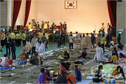 ↑ 실종자 가족들로 가득찬 진도군 실내체육관. (자료사진)