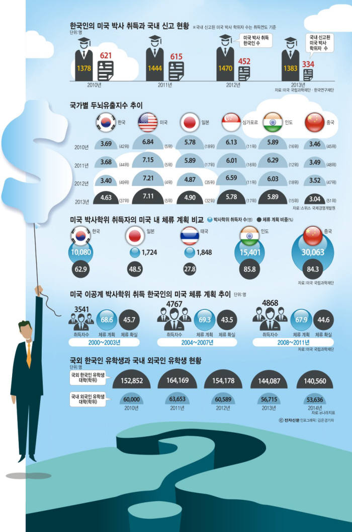 이공계 박사의 한국행 기피는 더 심각하다. 미국 국립과학재단 조사에서 이공계 박사(Science & Engineering)를 취득한 한국인 가운데 미국에 머물겠다고 응답한 사람은 2008~2011년 67.9%에 달했다.