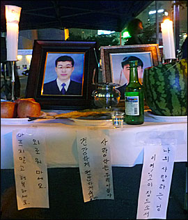 ▲ 고 황민웅, 고 연제욱 씨의 영정사진 23일 저녁 서울역 광장에서 열린 고 황민웅, 고 연제욱 씨 추모제에 한 켠에 마련된 영정사진과 제사상. 아래의 종이는 유족들이 직접 작성한 것이다.