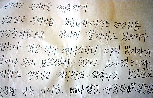 ▲ 고 연제욱씨에게 보내는 어머니의 편지 23일 저녁 서울역 광장에서 열린 고 황민웅, 고 연제욱 씨 추모제에서 낭독된 고 연제욱씨 어머니의 편지. 곳곳에 눈물 자국이 있다.