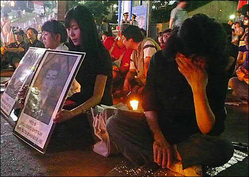 ▲ 눈물 흘리는 유족들 23일 저녁 서울역 광장에서 열린 고 황민웅, 고 연제욱 씨 추모제에 참석한 유족들이 영정을 들고 앉아 있다. 왼쪽부터 고 황민웅 씨의 부인 정애정 씨, 고 연제욱 씨의 동생 연미정 씨, 어머니 최술연 씨.