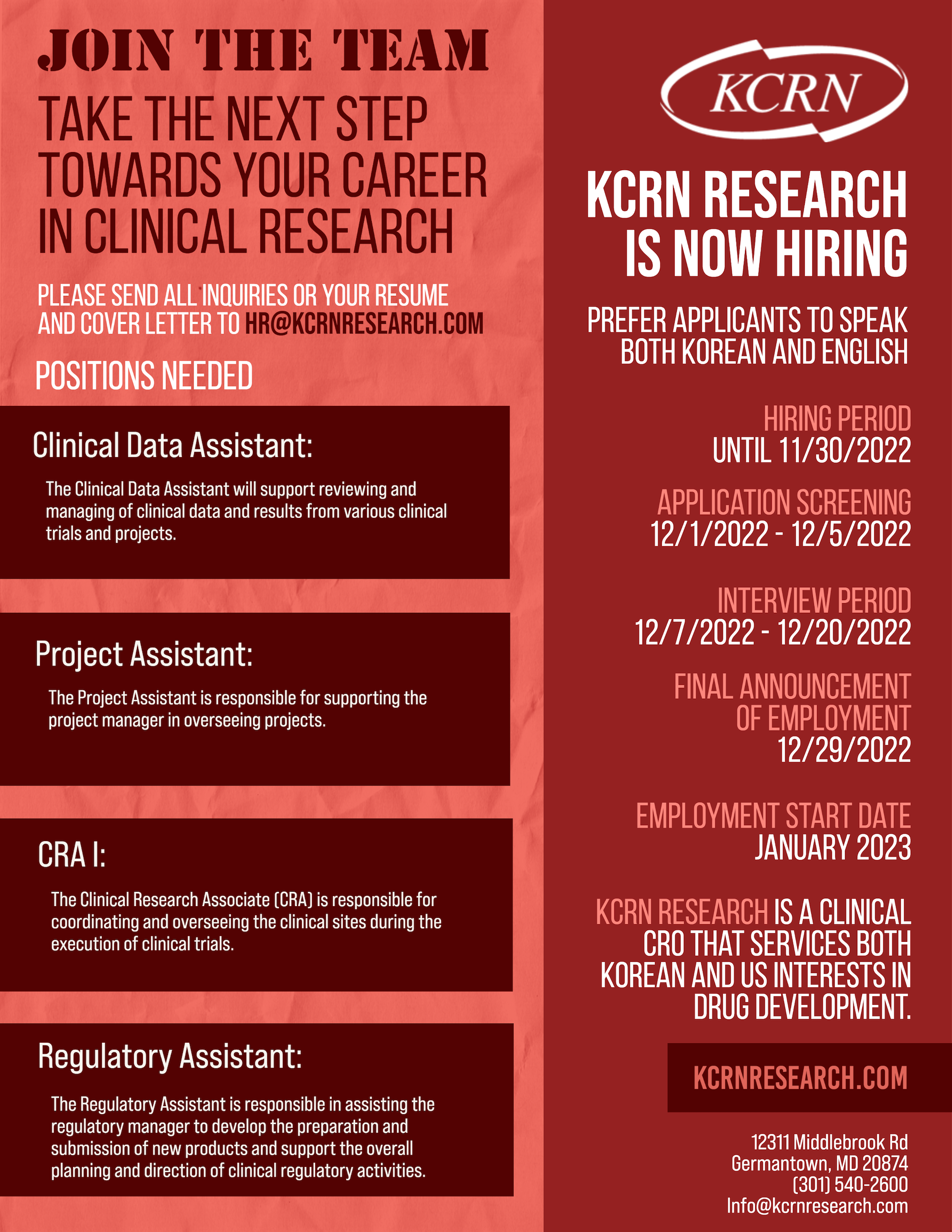 Hiring Event for Assistant Positions at KCRN Research (Clinical CRO)